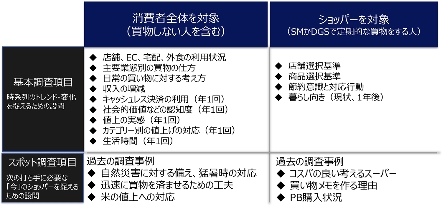 | 調査目的 | ショッパーの生活・意識・行動の変化をとらえ、対応策を検討するために3か月ごとに業態・店舗の利用状況、買い物に対する考え方、値上げへの対応などを把握する |