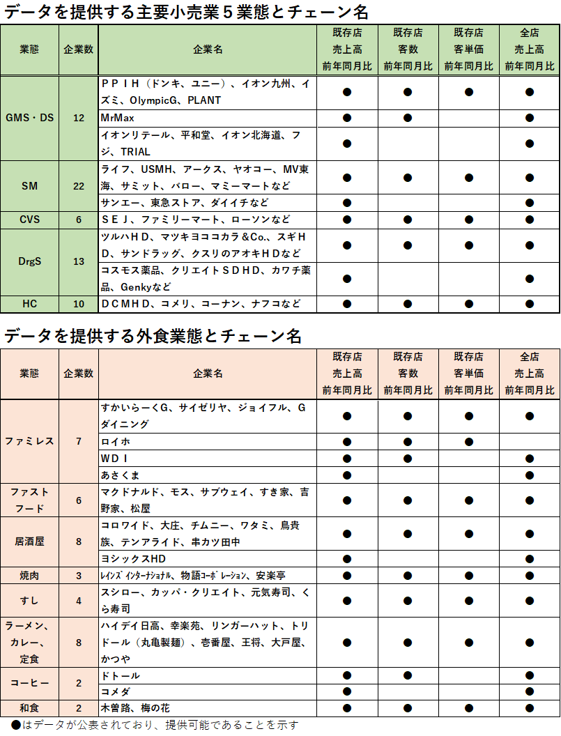 小売、外食の主要チェーンが毎月公表する既存店、全店の状況に関する数字も毎月収集し、研究会での報告に利用するとともに、加工可能なエクセルファイルでご提供します