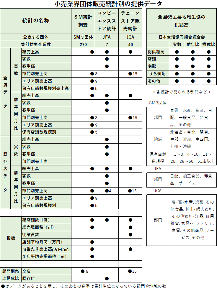 本研究会は各小売業態の動向を捉えるために月次で公表される業界団体の統計や官庁統計も随時利用しています これらの統計も毎月更新してご提供します